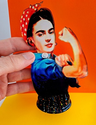 Plexi Klass Collection No. 1: Frida Kahlo vs Rosie . Print on glossy cut plexiglass, 15 cm high, mounted on a round black lacquered wooden base (6 cm x 1 cm), enhanced with Posca color splashes, domed varnish, ready to display on furniture, signed Height without base.