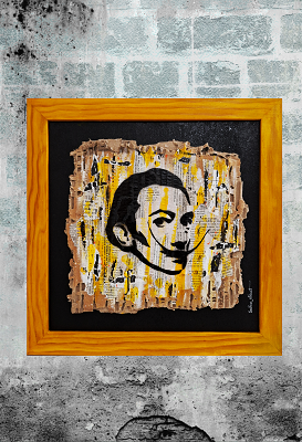 DALI Stencil with black spray paint on torn cardboard with glued strips of press clippings, splashes of white and black Posca. The cardboard is glued onto a medium board background, painted wood frame. Dimensions 5,90 inch x 5,90 inch x 0,59 inch. Limited edition of 1 copy. Hand-signed on the front. Ready to hang.