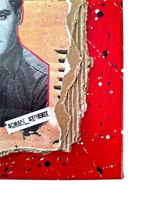 ELVIS SELFIE stretched canvas coton 380g/m² on frame ready to hang. Collage glued on torn cardboard fixed on a stretched canvas painted in acrylic. Visual of Elvis glued in relief (see photo) on torn cardboard. Visual dimensions 14 cm x 16 cm. Canvas dimensions 20 cm x 20 cm x 1.5 cm. Signed by the artist.