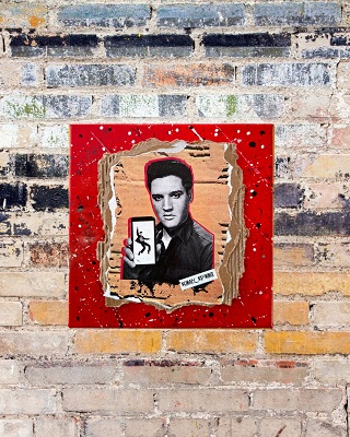 ELVIS SELFIE toile tendue en coton 380g/m² sur cadre prête-à-accrocher. Collage collé sur carton déchiré fixé sur une toile tendue peinte en acrylique. Visuel de Elvis collé en relief ( voir photo ) sur du carton déchiré. Dimension du visuel 14 cm X 16 cm. Dimension de la toile 20cm x 20cm x 1,5 cm. Signé par l’artiste.