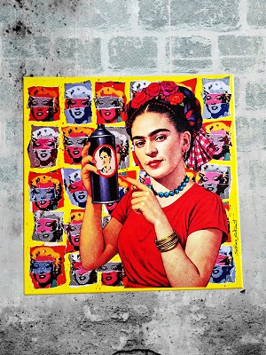 Canvas collage Frida Kahlo Spray Collage on 350g/m² cotton canvas, acrylic paint yellow, acrylic liant, glossy varnish finish, light pine wood framing, signed front/back. Height 15,75 inches x 15,75 inches x 0,70 inches. This artwork is not framed but ready to hang.