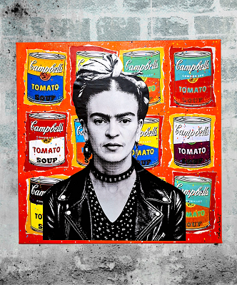 Canvas collage Frida Khalo Rock Collage on 380g/m² cotton canvas, acrylic paint orange, acrylic liant, glossy varnish finish, light pine wood framing, signed front/back. Height 15,75 inches x 15,75 inches x 0,70 inches. This artwork is not framed but ready to hang.